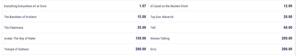 El gran favorito con una cuota de solo 1.07 es Everything Everywhere All at Once. Su primer competidor con una cuota de 12.00 es All Quiet on the Western Front. También hay otros grandes éxitos que puedes ver en la imagen, pero que no tienen muchas posibilidades en comparación con el favorito principal.