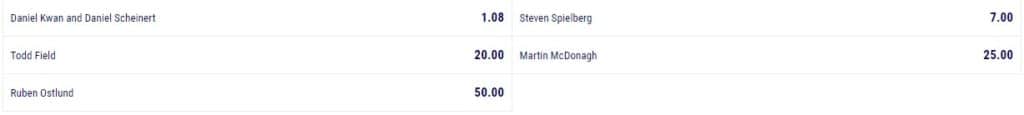 Daniel Kwan y Daniel Scheinert son así los claros favoritos, y Steven Spielberg es su primer competidor, a quien no se le dan muchas posibilidades de sorprender, por lo que la cuota para él y su dirección de la película The Fabelmans es de 7.00.